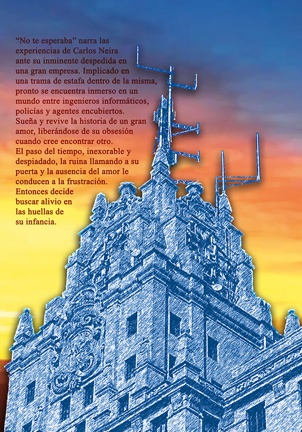 Un thriller emocional que mezcla con maestría el suspense, el amor y la intriga. No te esperaba narra la historia de Carlos Neira, un hombre atrapado entre los recuerdos de un amor perdido y las sombras de una conspiración corporativa. Tras décadas de trabajo, su repentina implicación en una trama financiera corrupta desencadena una serie de decisiones que pondrán a prueba su ética, su pasado y su futuro. Mientras los fantasmas del amor y la traición lo asedian, Carlos se ve obligado a desenterrar secretos y a enfrentarse a su propio reflejo. Una novela intensa, realista y profundamente humana que atrapa desde la primera página.